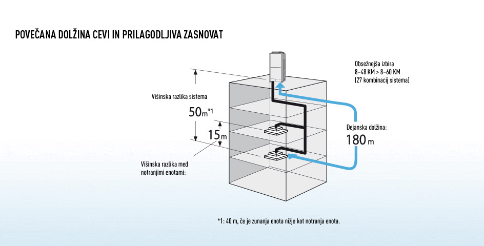 Povezati je mogoče do 64 notranjih enot, kar omogoča doseganje do 200-odstotne nazivne obremenitve notranje enote in učinkovito izkoriščanje sistema v raznovrstnih stavbah: funkcija široke povezljivosti zagotavlja enostavno zasnovo rešitev za šole, hotele, bolnišnice in druge velike objekte. Dolžina cevi do 1.000 m omogoča uporabo nove serije VRF ECOi v zelo velikih stavbah in kar najbolj prilagodljivo namestitev.