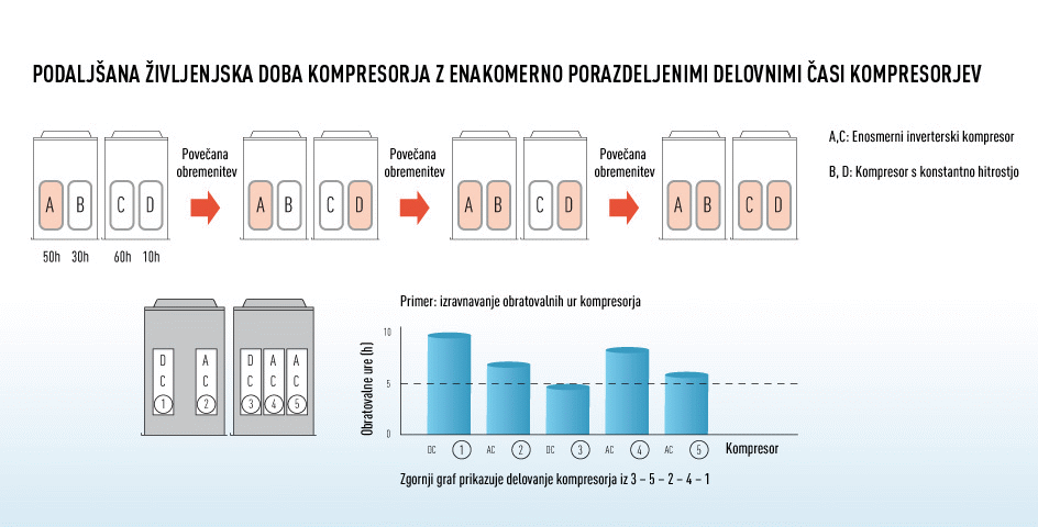 Mikroračunalnik nadzoruje skupni čas delovanja kompresorjev in skrbi za uravnoteženost delovnih časov vseh kompresorjev posameznega hladilnega sistema. Najprej se uporabijo kompresorji s krajšim delovnim časom.