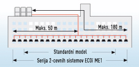 Vrhunska prilagodljivost zasnove cevne napeljave. Možnost prilagajanja različnih vrstam in velikostim stavb. Dejanska dolžina cevi 150 do 180 m. Maks. dolžina cevi 300 do 1.000 m.